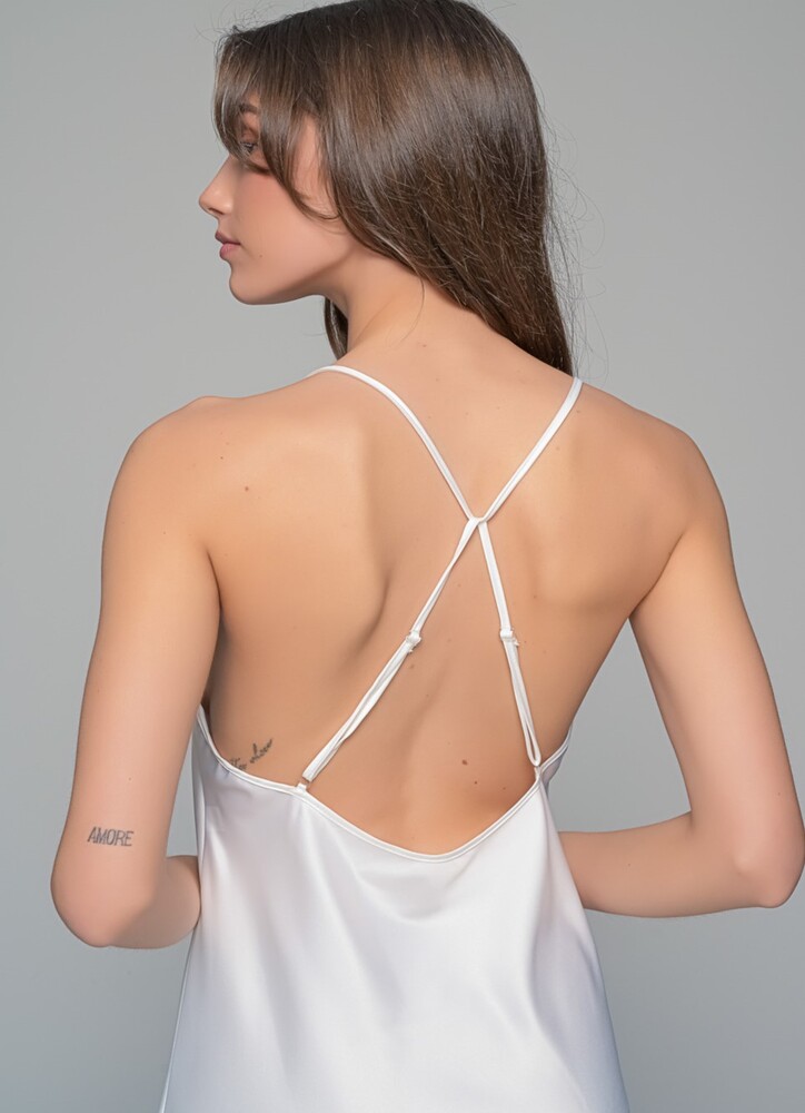 Μάξι σατέν νυχτικό-φόρεμα με υπέροχα λεία και απαλή επιφάνεια η οποία αγκαλιάζει μοναδικά το σώμα, προσφέροντας ανάλαφρη αίσθηση, άνεση και πολυτέλεια. Σχεδιασμένο σε κλασική, λιτή γραμμή απαράμιλλης αισθητικής και κομψότητας με ένα υπέροχο και διαφορετικό δέσιμο στην πλάτη. Διαθέτει διπλό ύφασμα στο στήθος για να μην διαγράφει. Το σατέν έχει ματ υφή. Σετ με ασορτί string.