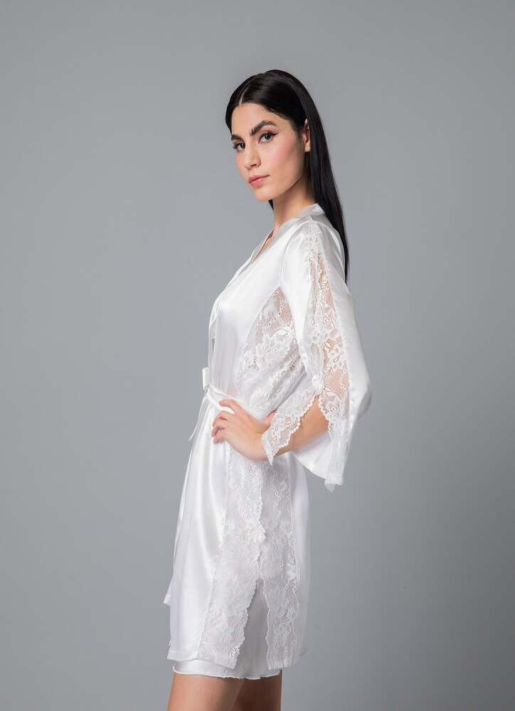 Νυφικό σατέν σετ με νυχτικό και ρόμπα. Συνδυασμός από μαλακό ύφασμα σατέν και πολυτελή φλοράλ δαντέλα. Μοναδική πολυτέλεια και υπέροχη γραμμή που αγκαλιάζει το κορμί! Το νυχτικό στο στήθος έχει επένδυση από το σατέν ύφασμα και μπροστά είναι διακοσμημένο με μεγάλο σατέν φιόγκο ενώ έχει και ρυθμιζόμενες τιράντες. Η ρόμπα έχει φάσες από την ίδια δαντέλα στα πλαϊνα που ενώνονται με σατέν φιογκάκια. Στη συσκευασία περιλαμβάνεται σατέν ζώνη και σατέν string δώρο.
